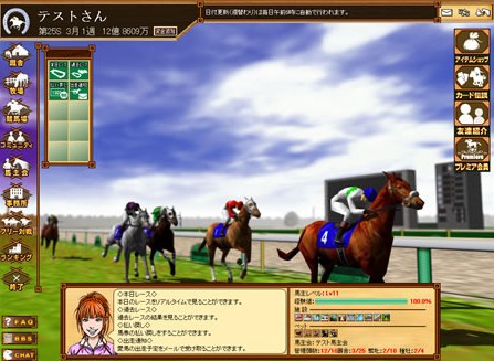 競馬伝説Live!はオンラインの競馬育成ゲームです! プレイヤーは「馬主」として、自分の馬を生産し、調教して、レースに登録します。毎日行われている公式レースでは、同じように頂点を目指す全国のライバルたちと対戦しながら、真の「ベストブリーダー」を目指すことになります。 JRA公認のオンライン競走馬育成シミュレーションゲームなので、プロ級のスーパープレイヤーもいたりします! |